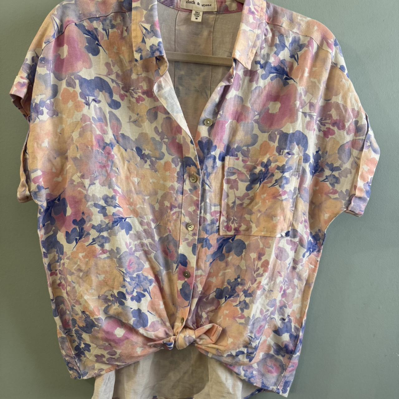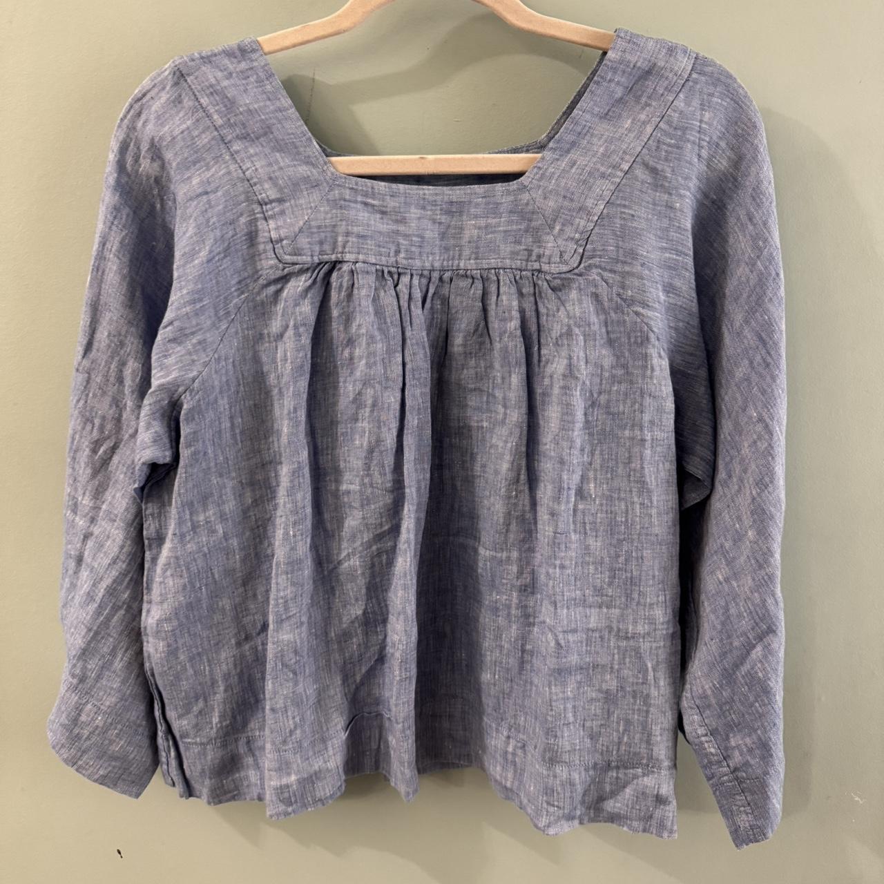 Gap blue linen blouse with square neckline and 3/4 sleeves. Size: XS but would fit a small because it’s oversized...