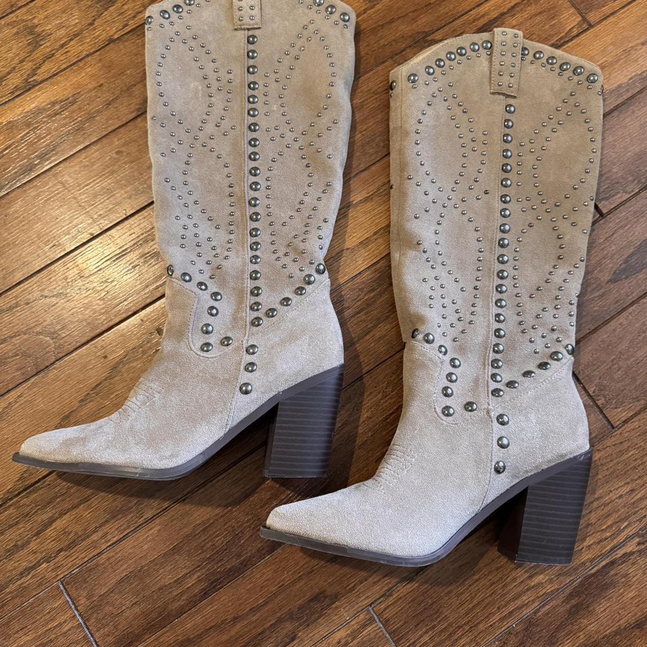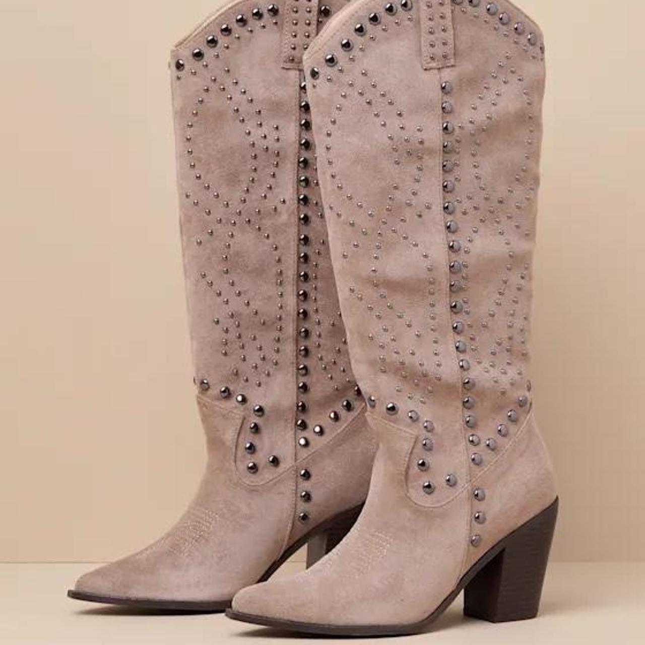 Lulus Mallerie Taupe Suede Studded Knee-High Western Boots size 7. Currently sold out on website.